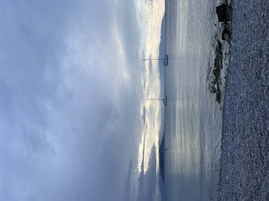 The image displays a coastal scene in Greece, location unknown. The foreground consists of a pebble beach, predominantly composed of dark grey, smooth stones of varying sizes. On the right side of the beach, a small formation of larger, eroded rocks is visible at the water's edge. The midground features calm, grey-blue sea water exhibiting slight ripples, reflecting the overcast sky. Three white-hulled, single-masted sailing yachts are positioned on the water; one is on the far left, partially obscured by a dark, low-lying island or promontory, while the other two are more centrally located, with their masts upright and sails furled. The background reveals a distant, hazy mountain range spanning the horizon. The sky is largely covered by dark grey and purplish clouds, with scattered lighter patches on the right allowing visible crepuscular rays to penetrate. No individuals, animals, or explicit actions are present within the frame.