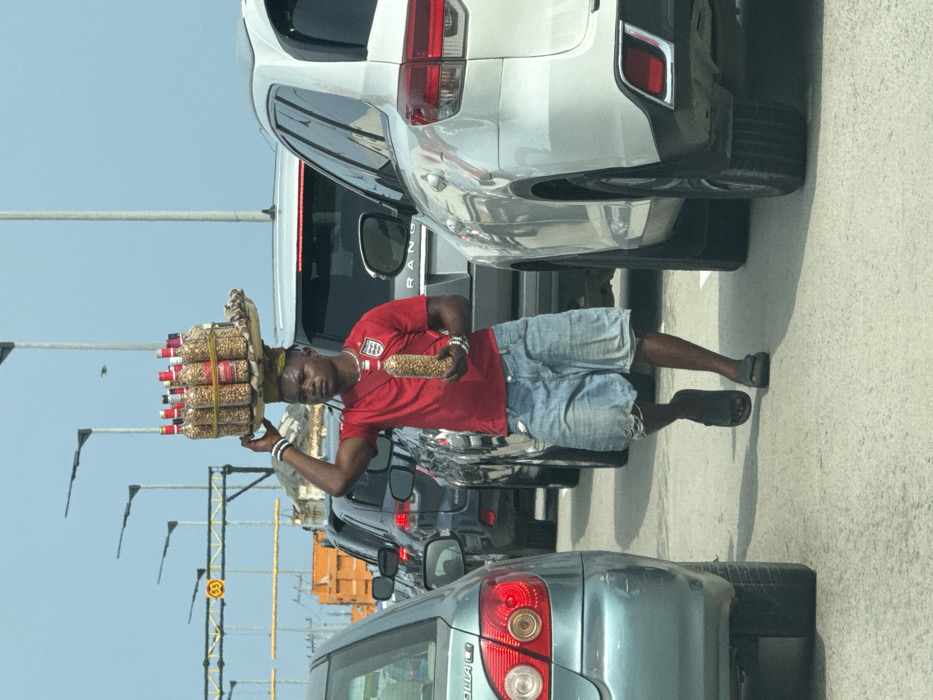 - "In Alaguntan, Nigeria, a male individual walks along a multi-lane roadway amidst stopped traffic under a bright, hazy sky" by FM-ddIDX2, licensed under CC BY 4.0