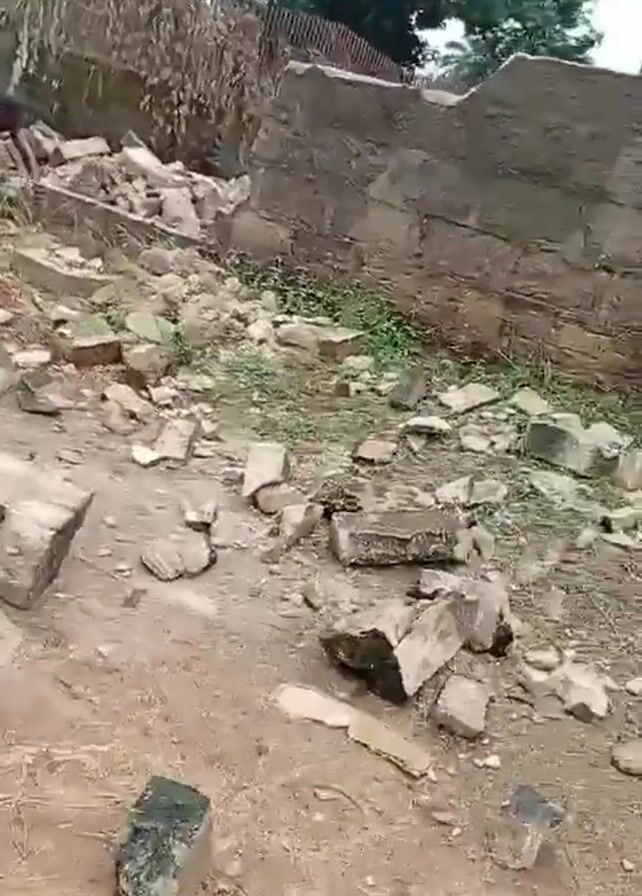A man in green shorts is clearing debris from a construction site. The site appears to be the remnants of a damaged or demolished building, with broken concrete blocks and red dirt scattered around. The man is working on a mound of earth and concrete, possibly digging or clearing the area. In the background, there's a partially visible structure with a corrugated metal roof and a fence covered in dried foliage. There are also trees, including palm trees, suggesting a tropical or semi-tropical environment. The ground appears to be a mix of dirt and sandy soil. The lighting is moderate, suggesting an overcast day.