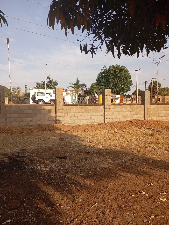 A partially constructed wall of cinder blocks stands in a field of dirt and sparse vegetation