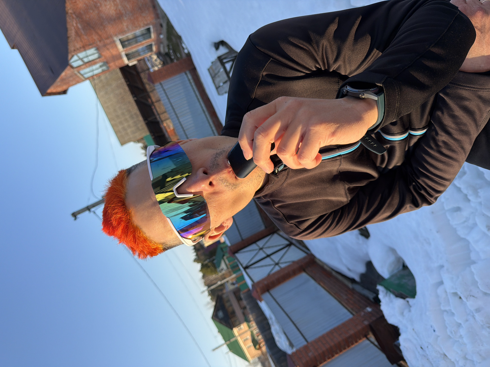 A low-angle shot depicts a man with bright orange hair and iridescent white-framed sunglasses using an electronic device near his face. He is wearing a dark jacket with light blue and white trim on the sleeve, and a smartwatch on his left wrist. The background includes a snowy landscape, a building with a rust-colored roof and exposed structural elements, and clear blue sky. The location appears to be in Chaikovsky, Russia, based on architectural style and environmental elements.