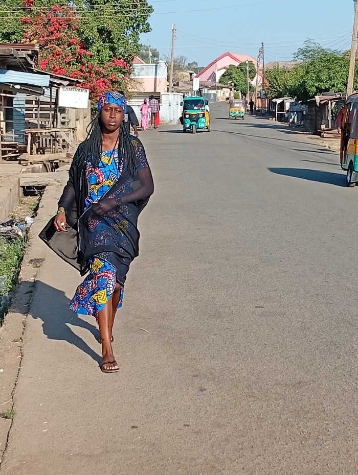 A woman walks down a paved road in a sunny locale. She wears a colorful patterned dress, matching head covering, and dark shawl. A sidewalk and building are to her left. On the road behind her are a few auto rickshaws, and pedestrians are on the sidewalk on the opposite side of the street. A pink-roofed building is visible in the background.