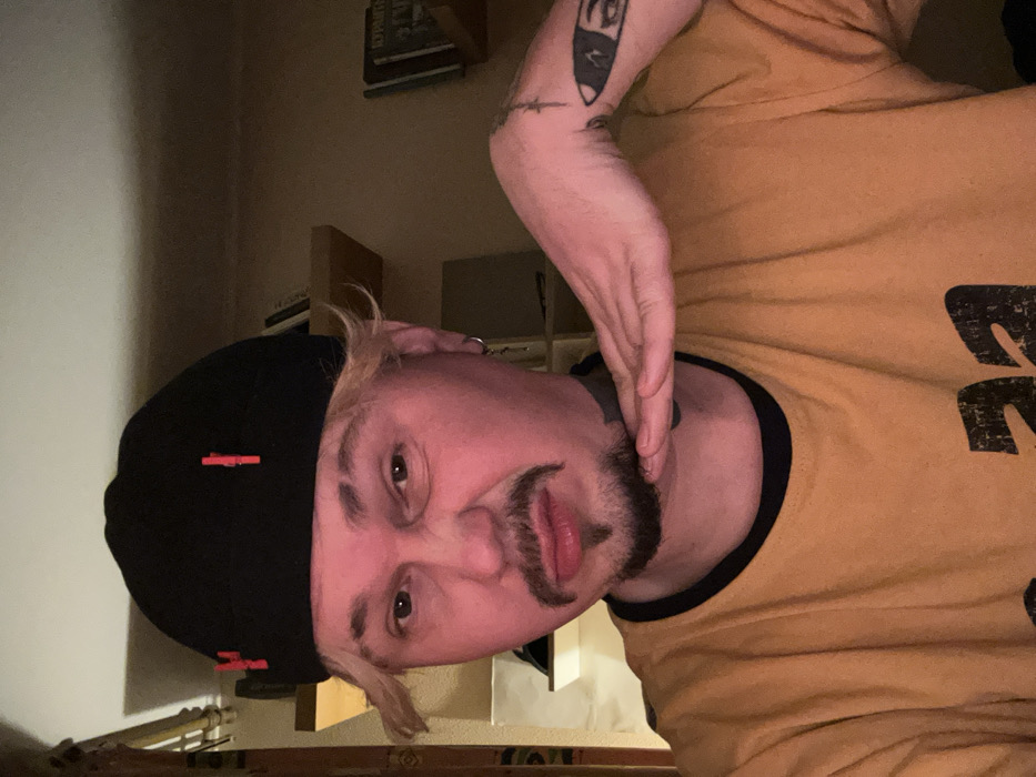 A man wearing a black beanie with red accents poses for a selfie. He has a fair complexion, a trimmed beard and mustache, and blonde hair. He is wearing a mustard yellow t-shirt with a black collar and a faded design. His left hand is raised to his neck. A tattoo is visible on his left arm. Books and furniture are visible in the background. The image is rotated.