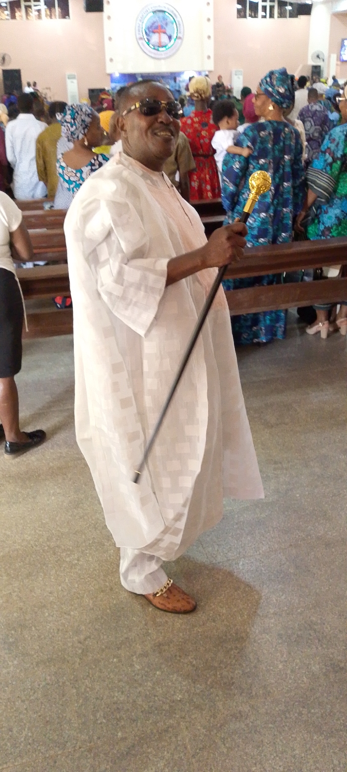 An adult male stands prominently in the foreground of a church interior in Kubwa, Nigeria. He wears a white, subtly patterned Agbada, black sunglasses with gold temple accents, and brown loafers with a gold chain detail. In his right hand, he holds a black walking stick with an ornate gold spherical top. The man is smiling broadly towards the left of the frame. In the background, numerous individuals are present, some seated in wooden pews and others standing, many dressed in colorful traditional Nigerian attire, including headwraps. A woman in a blue patterned garment is seen holding a child. A large, internally lit circular emblem of the 'Apostolic Faith Church,' featuring a cross within an open book, is mounted on a light peach-colored wall at the rear. The floor is light grey, and overhead lighting fixtures are visible. The scene depicts a religious gathering.