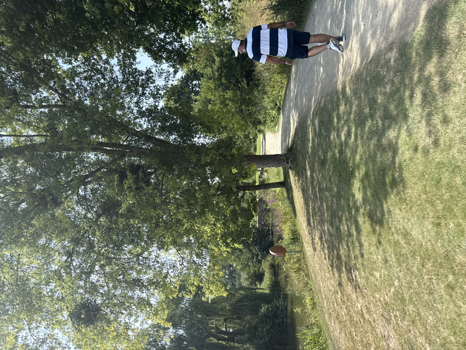 The image displays an outdoor natural environment in Lenningen, Luxembourg, under a clear sky with bright sunlight. A single adult male is observed from behind, walking away from the camera on a light-colored dirt path that extends into the distance, curving slightly to the right. The male wears a white baseball cap, a white and navy blue horizontally striped short-sleeved shirt, dark shorts, and light-colored athletic shoes. To the left of the path, a calm body of water, identified as a river or canal, runs parallel to the walking trail. Its banks are covered in green vegetation, including tall reeds and willow-like trees. A red, circular object, consistent with a lifebuoy, is mounted on a pole near the water's edge in the mid-ground. Further along the water, a multi-arched stone bridge is partially visible. The scene is dominated by large deciduous trees with full green foliage, particularly on the right and center. One prominent tree positioned centrally features a large, dark, globular mass, possibly a bird's nest or a parasitic growth, visible high within its branches. Shadows from the trees are cast across the dirt path and the ground, which consists of grass varying from green to drier, lighter tones. The overall environment suggests a well-maintained walking area.