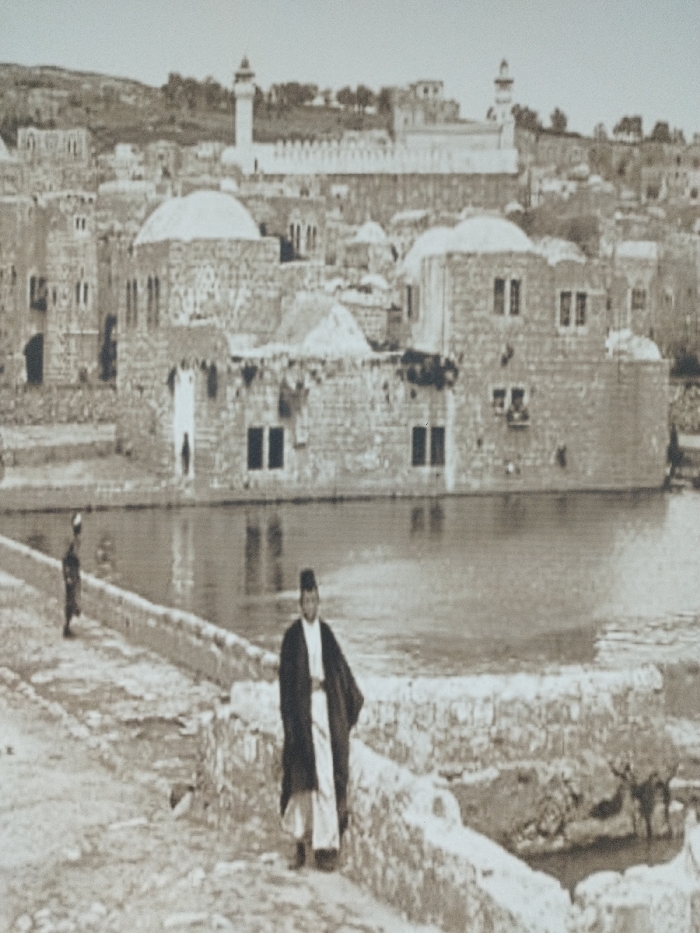 - "This sepia-toned photograph depicts a historical street-level view within Hebron, Palestinian Territory, centered around one of the city's large water reservoirs, identifiable as either Birket al-Qazzazin or Birket el Sultan" by FM-sbnkb2, licensed under CC BY 4.0