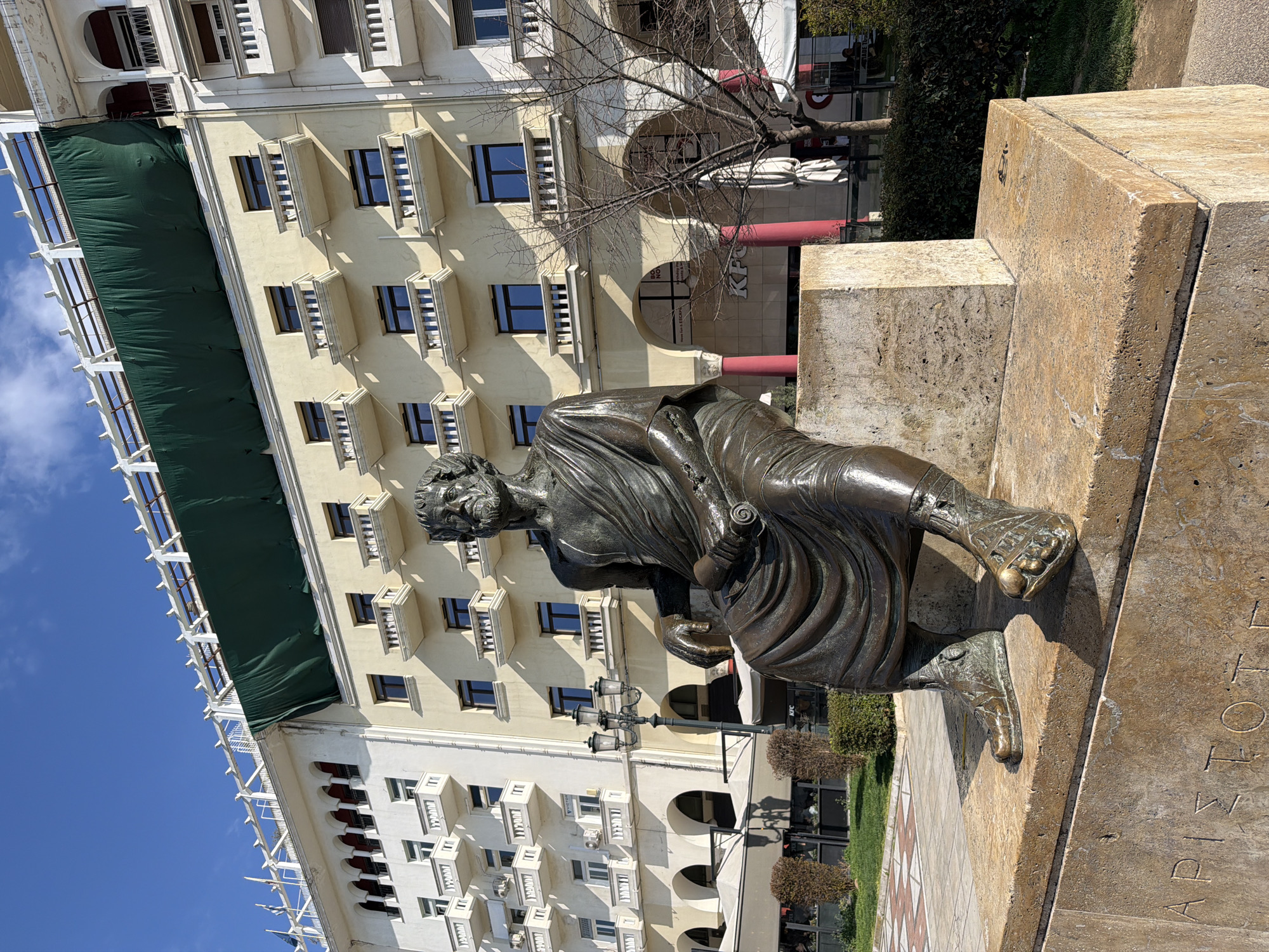 The image displays a bronze statue of the philosopher Aristotle seated on a light beige, textured stone pedestal in Aristotelous Square, Thessaloniki, Greece. Aristotle is depicted with a beard, draped in a toga-like garment, holding a scroll in his left hand, with his right hand resting on his knee. The Greek name "ΑΡΙΣΤΟΤΕΛΗΣ" is carved into the front of the pedestal. Behind the statue, two multi-story buildings rise under a clear blue sky. The central building, painted a light cream color, features multiple floors of uniform windows and small balconies with balustrades. The upper facade of this building is extensively covered by a dark green construction net. To the left, a white building exhibits similar architectural styles, including arched openings on lower floors and multiple balconies. In the mid-ground, between the statue and the buildings, a paved public area transitions into a strip of manicured bushes and a deciduous tree devoid of leaves. A vintage-style triple-lamp streetlight stands. Further back, outdoor seating areas with white awnings belonging to cafes are visible, along with a prominent "KFC" sign and red support columns beneath an archway of one of the buildings. The scene is brightly illuminated by direct sunlight, casting distinct shadows.