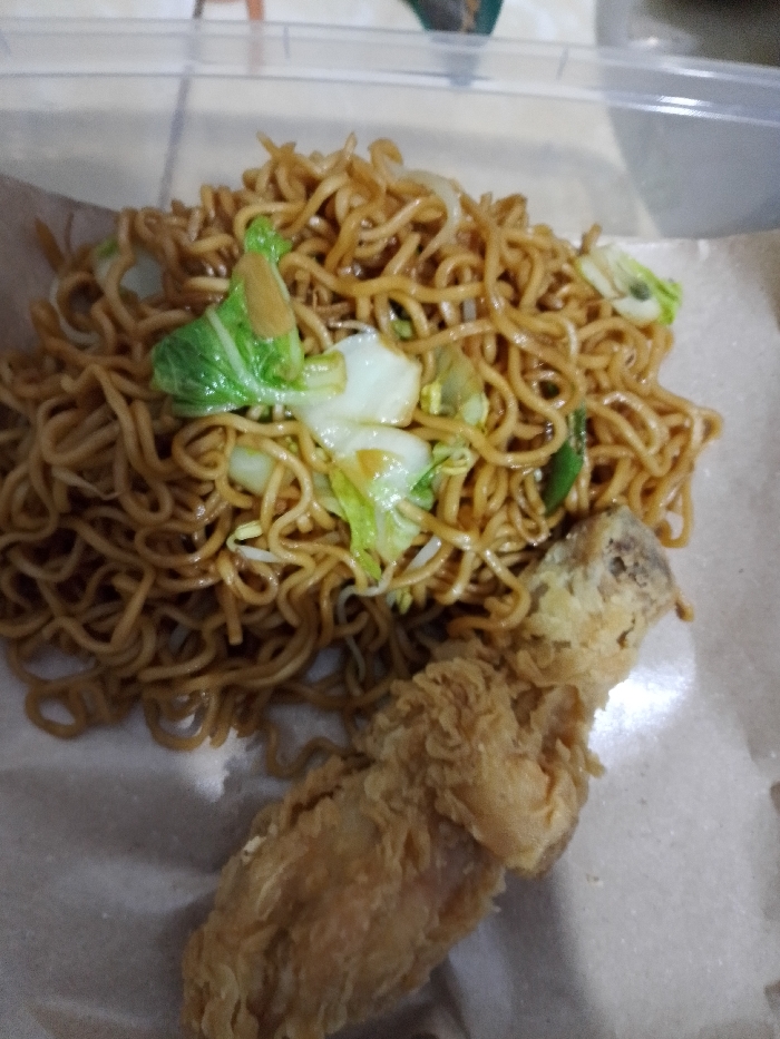 - "The image depicts a meal consisting of stir-fried noodles and a piece of fried chicken, presented on light brown paper" by FM-18r9D3, licensed under CC BY 4.0