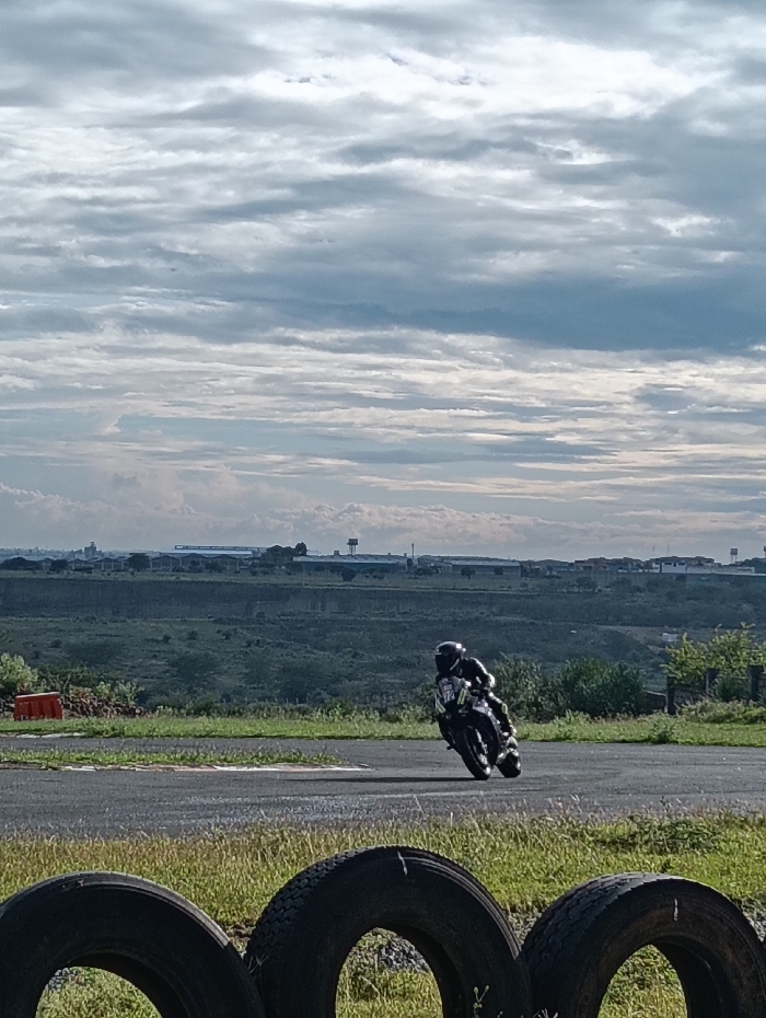 The image displays an outdoor scene in Matathani ward, Kenya, featuring a motorcyclist on a paved track. A single individual, dressed in dark racing leathers and a matching full-face helmet, is riding a dark-colored sport motorcycle, leaning significantly into a left turn on the asphalt surface. A white number plate, bearing dark numerals that appear to be "172", is visible on the front of the motorcycle. In the immediate foreground, three dark, used tires are partially visible, serving as trackside barriers, positioned on a grassy verge. To the left of the track, a small red or orange object is present on the ground. The midground beyond the track consists of green, undulating terrain with sparse vegetation. The distant background presents a hazy urban or industrial skyline with multiple buildings and what appear to be water towers. The sky is heavily overcast with multiple layers of grey and white clouds.