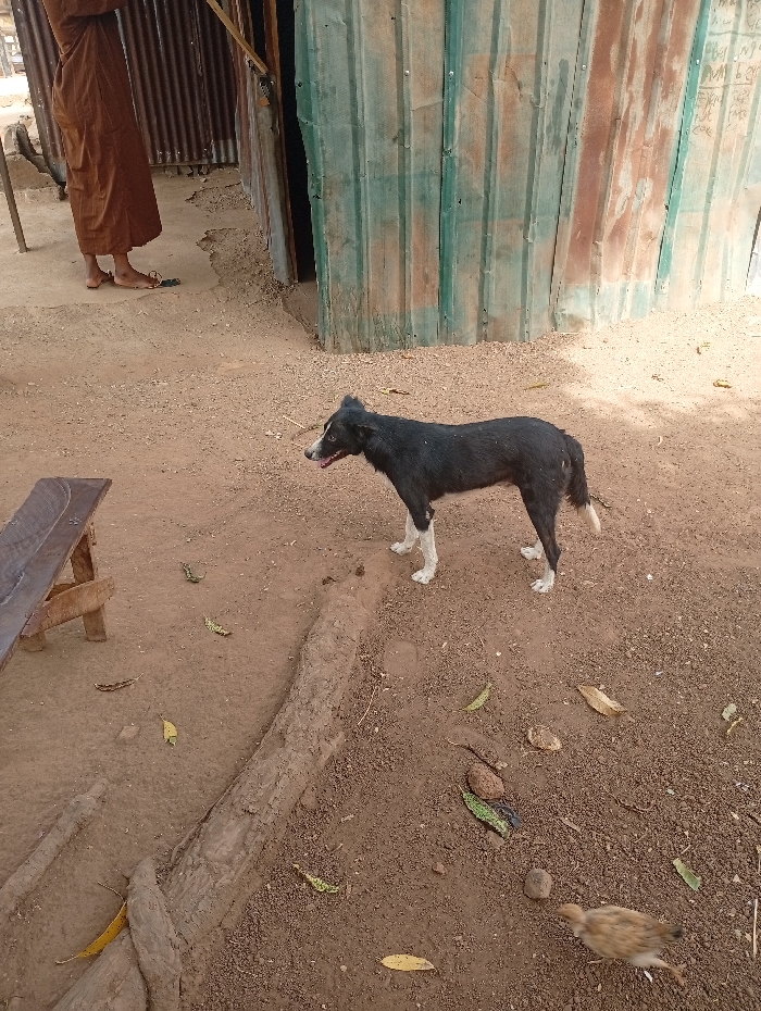 A black dog stands in a dirt yard with sparse grass and fallen leaves. The dog has white paws and a white-tipped tail. Behind the dog is a corrugated metal building, and a person in brown robes is partially visible on the left. A small chick is running away from the dog in the lower right corner. A wooden bench sits to the left of the dog, next to a large root or log.