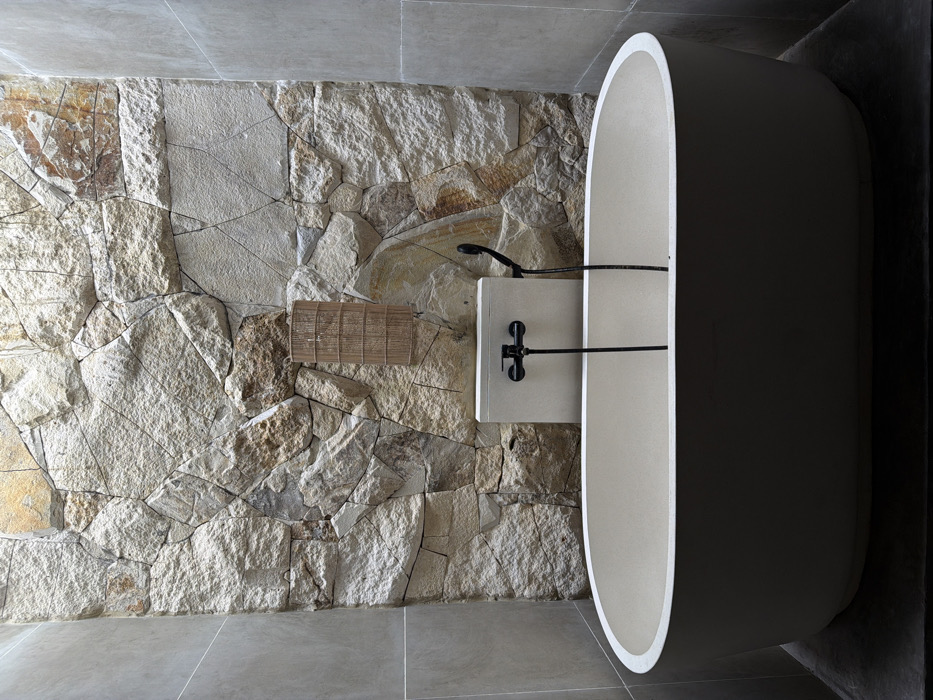An overhead shot showcases a modern bathroom. A freestanding oval bathtub with a thick, matte gray exterior stands against a wall adorned with textured, light beige stone. A rustic, woven accessory hangs on the wall beside a sleek, minimalist faucet and shower fixture mounted on a light-colored, rectangular base. Gray tiles cover both the floor and upper wall, creating a cohesive, neutral palette.