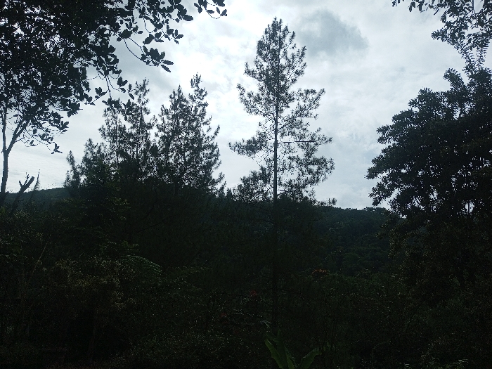 The image displays a densely vegetated landscape located in Sarwahi Mal., India, under an overcast sky. The scene is characterized by various trees and dense foliage rendered in dark silhouettes against a cloudy, light grey sky occupying the upper third of the frame. In the upper left, dark, broad-leaved branches are visible, partially framing the sky. Several tall, slender conifer-like trees stand prominently in the central and upper-central portions, with one notably tall specimen appearing near the image's center. To the right, a large tree with a dense, dark canopy is partially visible. The lower two-thirds of the image are filled with dark, thick vegetation, indicating a forested hillside or dense undergrowth. No human figures, animals, or man-made structures are discernible within the frame. The overall lighting is dim, casting the foreground and midground vegetation into deep shadow.
