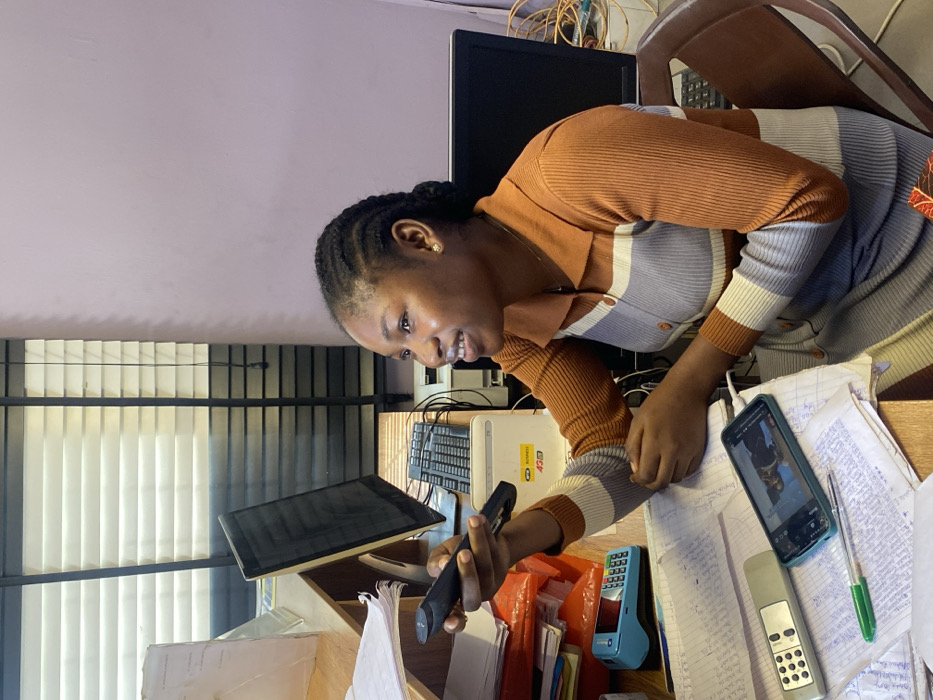 The image depicts a young adult female seated at a wooden office desk in Egan, Nigeria