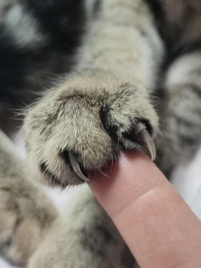 A close-up photograph displays a domestic cat's paw gripping a human finger
