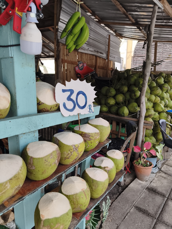 A vibrant display of fresh coconuts are arranged on turquoise shelves beneath a weathered roof. The coconuts, partially shaved, reveal a white interior, emphasizing their ripeness. A sign boldly displays the price "30 B," suggesting a tropical market scene. Bunches of green bananas hang above, complementing the coconuts. In the background, a large pile of whole green coconuts rests, along with red and green decorative accents, and a glimpse of a sidewalk.