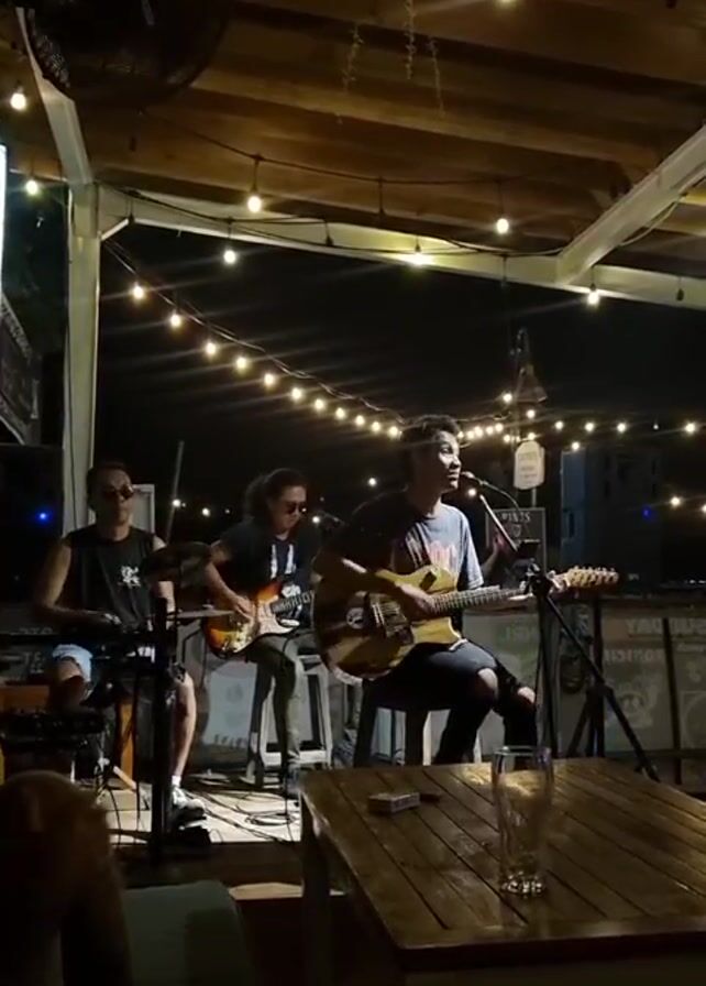 A three-person band is playing live music at an outdoor venue at night. The band consists of two guitarists and a keyboardist, all seated. The lead singer is playing an acoustic guitar and singing into a microphone. String lights are hung above the band, creating a warm ambiance. A table with a glass of water is in the foreground. People can be seen sitting at the table, watching the performance. The overall atmosphere is relaxed and casual.