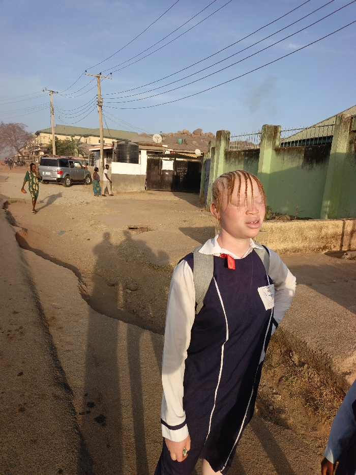 An albino child wearing a school uniform with a backpack stands on a cracked, dusty street