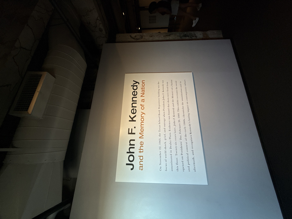 A sign titled "John F. Kennedy and the Memory of a Nation" discusses the event of November 22, 1963, when the Texas School Book Depository building became a place of shock as President Kennedy was assassinated in Dealey Plaza. The sign mentions that evidence indicates shots were fired from that building. Twenty-six years later, the exhibit "John F. Kennedy and the Memory of a Nation" opened, which recreates the social and political context of the early 1960s, addresses the aftermath of the assassination, and recognizes Kennedy's impact.