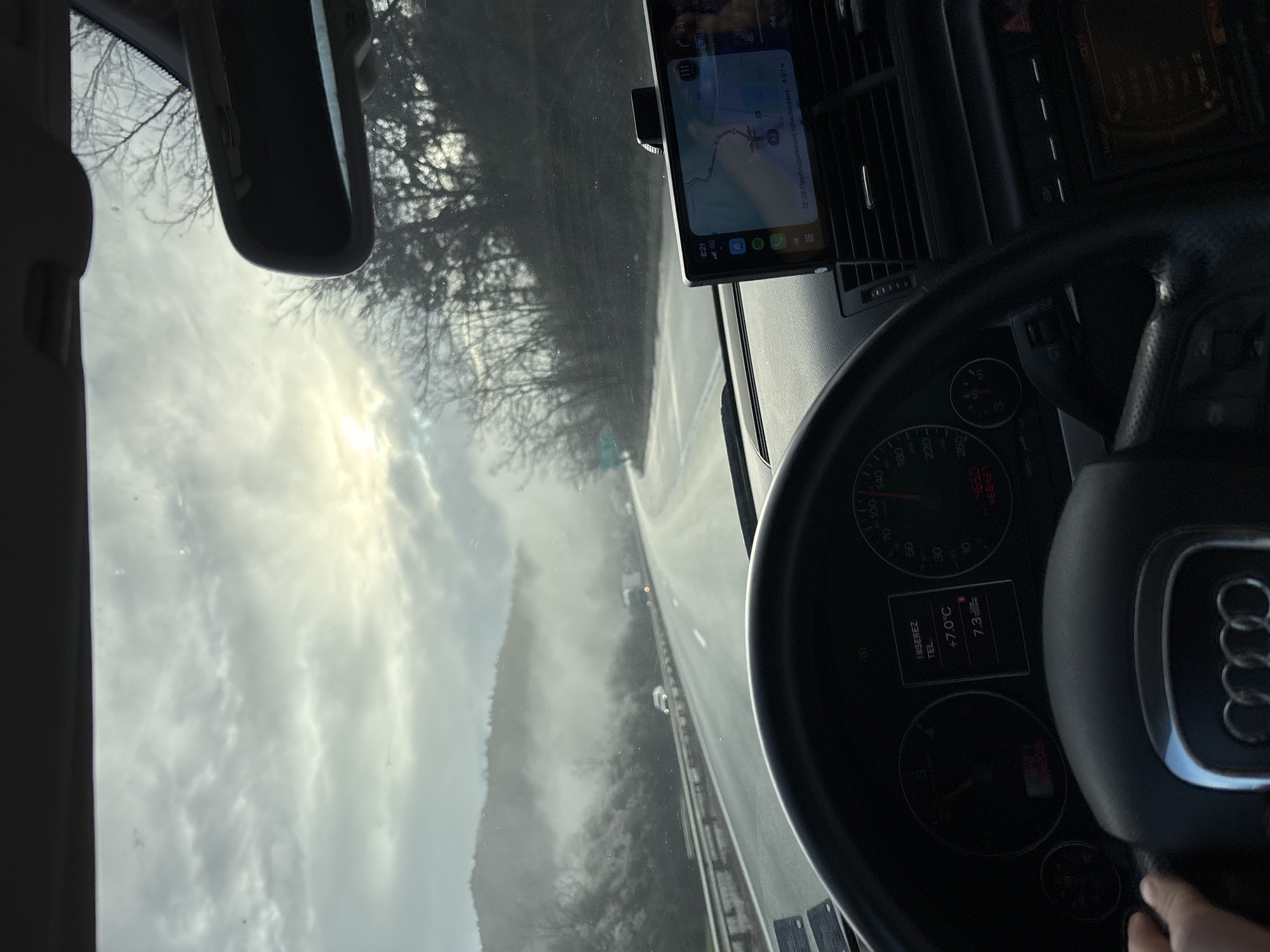 The image is taken from inside a car, likely an Audi based on the steering wheel and dashboard