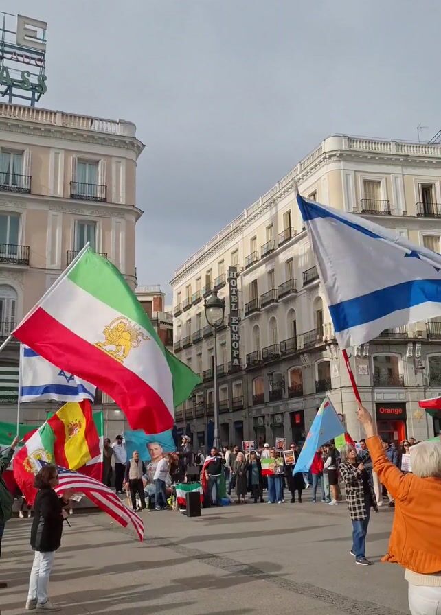 group of people gathered in a plaza in what appears to be a city in Europe. People are holding and waving flags of Iran, Israel, the United States, Spain, and what looks like an additional flag that is blue with a white stripe. The crowd appears to be at a rally or demonstration. Some people hold signs. The buildings in the background are multi-story with multiple windows. The plaza appears to be cobblestone. The day is cloudy.