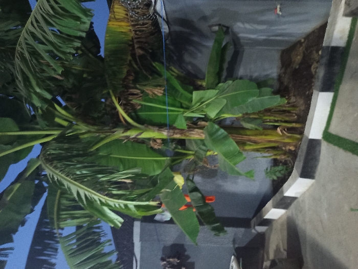A banana plant with large green leaves dominates the frame. Some leaves are yellowing. A thin blue string is tied around the plant's stalk. The plant sits alongside a curb with alternating black and white stripes. The background features a gray wall or surface. Part of a dark, cloudy sky is visible at the left. The scene seems to be an outdoor setting, possibly a garden or near a building.