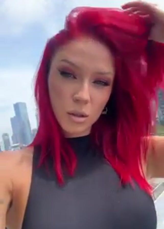 A woman with bright red hair and a black tank top is standing on a balcony or rooftop, filming herself