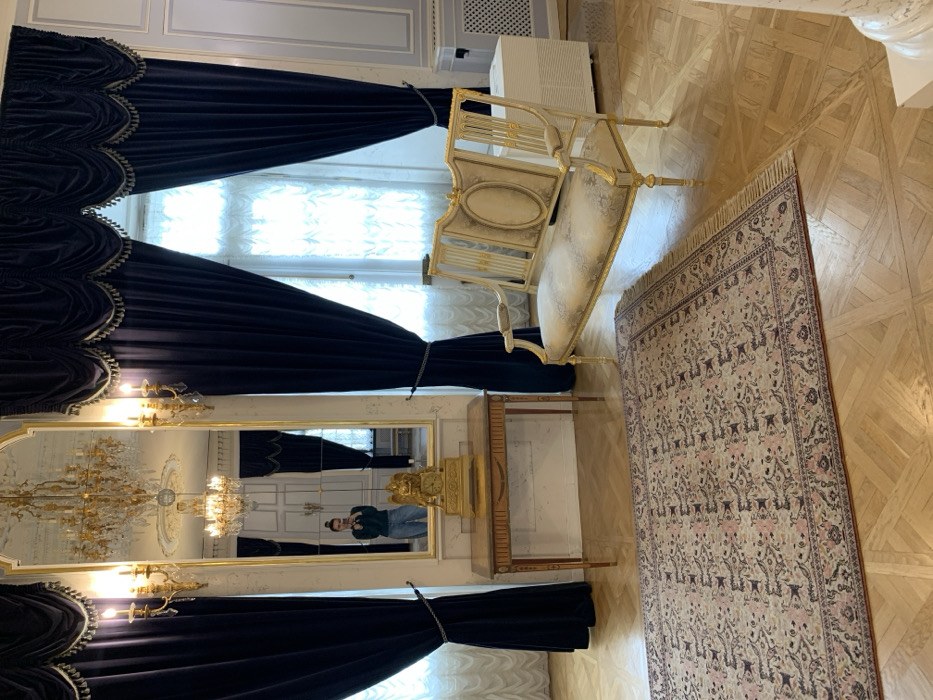 This interior photograph depicts a grand hall within Nesvizh Castle in Nyasvizh, Belarus. The room features a light-toned herringbone parquet wooden floor, centrally overlaid with a rectangular ornamental rug exhibiting intricate patterns in pink, burgundy, and dark brown. Against the back wall, a large, arched gilded mirror is centered, flanked by two illuminated gold sconces with multiple candle-shaped bulbs. The mirror reflects a female individual, likely the photographer, capturing a selfie with a smartphone; she is wearing a dark green long-sleeved top and light blue jeans, with her hair pulled back. Also visible in the reflection are a large crystal chandelier suspended from the ceiling and decorative wall paneling. Below the mirror, a wooden console table with fluted legs supports a prominent gilded mantel clock adorned with classical ornamentation. Dark blue velvet curtains, featuring elaborate valances with tassels, frame both the mirror and a large window situated to its right. These curtains are tied back with decorative ropes, revealing sheer white curtains behind the window. To the right of the window, an ornate two-seater settee with a gilded wooden frame, light-colored upholstery, and an oval medallion on its back rests on the parquet floor. In the far right background, a white rectangular unit, possibly an air conditioning component or covered radiator, stands next to a gray wall-mounted radiator grill. The room's walls are light-colored with decorative paneling and molding.