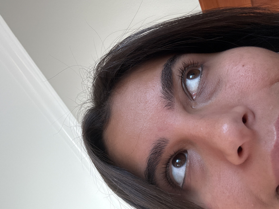 The image displays a close-up, upward-angled view of a person's upper face, specifically a female with dark brown hair and warm-toned skin