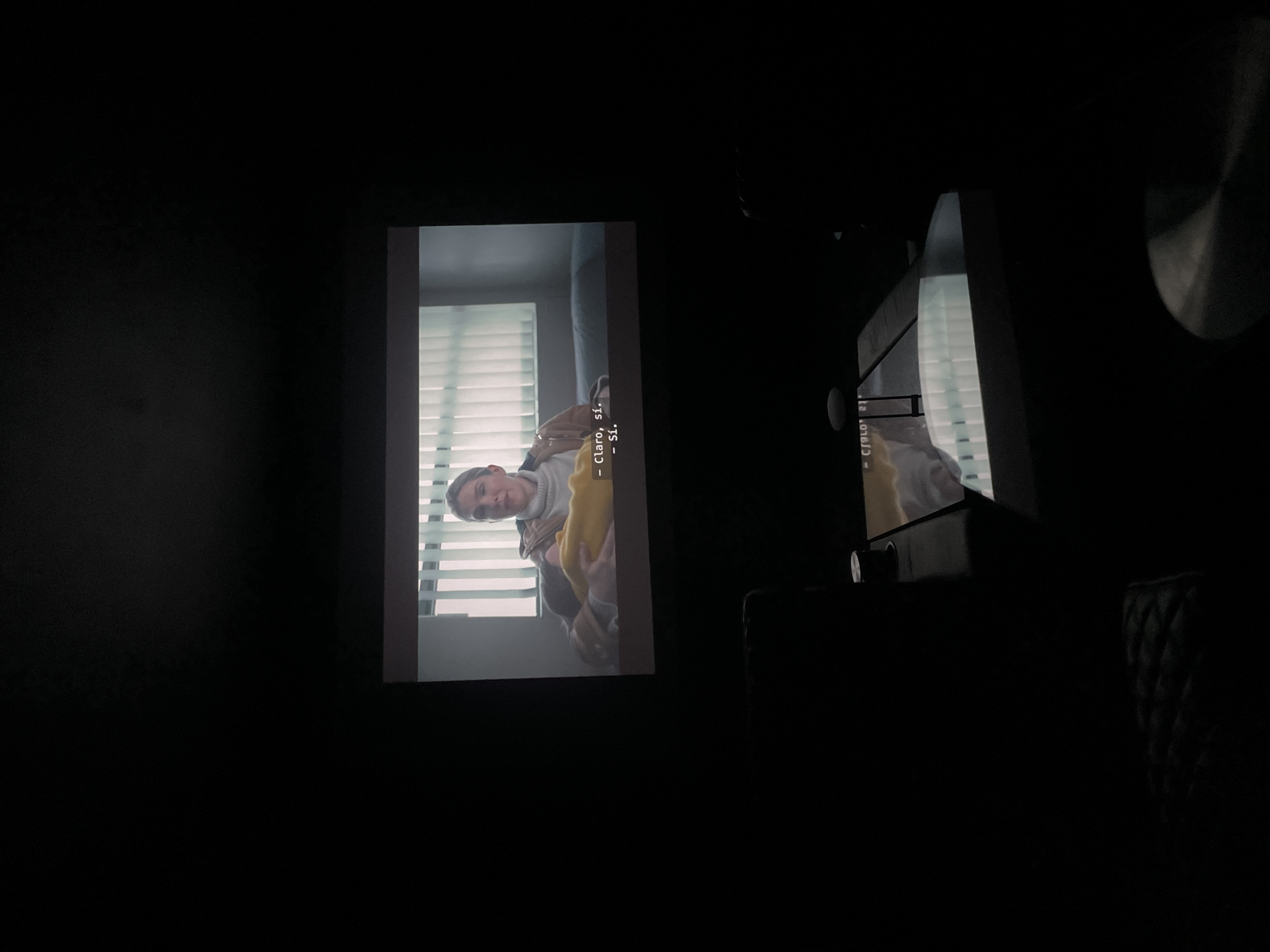 A screen displays a scene with a person in front of blinds, with subtitles that read "- Claro, sí. - Sí.". The scene is dark, and the screen is positioned to the right of another screen or surface. The location is in Zibatá, Mexico.