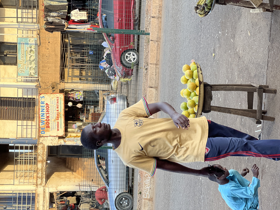 This image captures a daytime street scene in Bukuru, Nigeria, depicting a commercial area with multiple shops and pedestrian activity. In the foreground, an adult male with a dark complexion walks towards the viewer's left while his head is turned to the right. He wears a gold-colored t-shirt with a Nike swoosh and an FC Barcelona crest on the chest, along with navy blue track pants featuring red vertical stripes. His left arm hangs down, while his right arm is bent at the elbow. Adjacent to his left leg, a child in a light blue garment is positioned low to the ground, appearing to be stooping or reaching downwards; only the upper torso and head are distinctly visible. To the right of the man, a metal tray filled with green and yellow oranges rests on a rustic wooden stool. Further to the right and partially out of frame, another similar stool supports a tray containing green bananas. A metal grid fence runs horizontally across the midground, separating the foreground activity from the street. Behind this fence, an asphalt road surface is visible. A silver sedan is parked on the left side of the street, and a red hatchback is parked on the right, both appearing to be in a static position. The background consists of multi-story concrete buildings with a faded yellowish-brown facade. Prominently displayed on one building is a sign for "DE WINNER'S BOOKSHOP," featuring red text on a white background and listing services such as "Dealers on all kinds of Text Books, such as Stationery, Office Equipments, General Merchandise," along with phone numbers. Above the bookshop sign, a blue sign for "Baflex BARBING SALOON" is visible, depicting stylized haircuts. Various items, including clothing garments and bags, are displayed outside the shops on either side. Strong sunlight illuminates the scene, casting shadows, and indicates an outdoor, daytime setting. Several individuals are faintly visible in the background near the shops and vehicles.