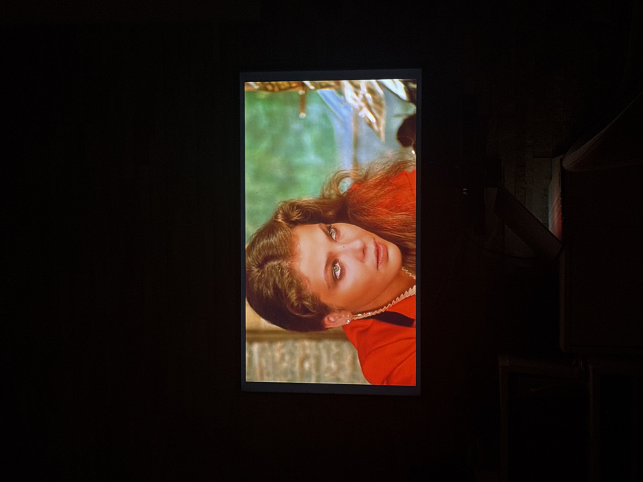 An illuminated portrait of a woman with auburn hair and striking green eyes is displayed against a stark black background. She is wearing a red top with a white, ruffled collar. The background behind her appears to be a faded green with hints of gold. The portrait is slightly tilted, creating a dynamic visual element. To the right, indistinct dark shapes suggest the presence of furniture or architectural details in the surrounding space.