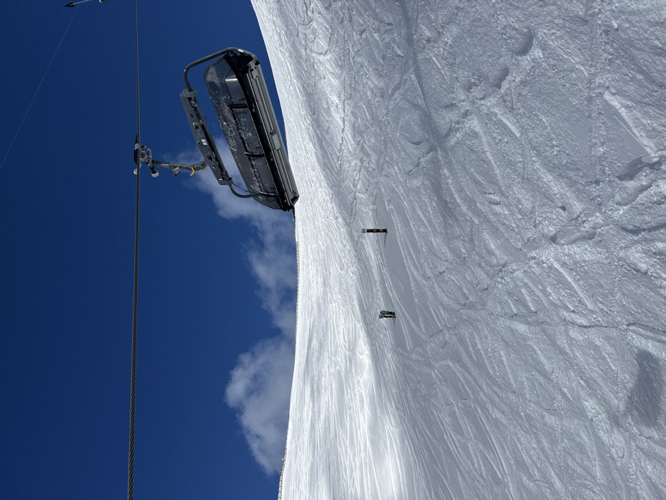 The image displays a winter mountain landscape in Estosadok, Russia, under a clear, deep blue sky with scattered white clouds near the distant horizon. A single, empty, black ski chairlift, showing light snow accumulation on its surfaces, is suspended from a thick steel cable in the upper right portion of the frame. The cable runs horizontally across the upper midground. The foreground and midground are dominated by a vast, white, snow-covered slope heavily marked with numerous ski tracks. Two dark-colored marker poles, one featuring a yellow top band, protrude from the snow in the midground. A dark fence or netting is visible along the far edge of the snowy ridge in the background. No individuals are present in the scene.