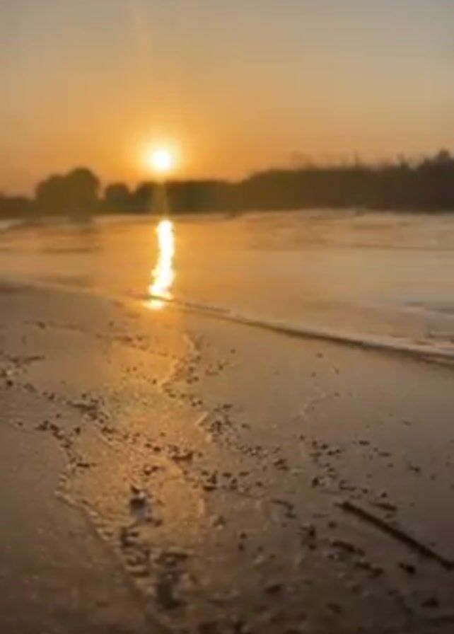 The video depicts a serene beach scene at sunset. The sun, a bright orange orb, is setting on the horizon, casting a golden glow across the sky and water. Gentle waves lap at the sandy shore in the foreground. The sand is wet and reflects the warm light, with small debris scattered across its surface. Silhouetted trees and foliage are visible in the distance. The overall atmosphere is tranquil and calming.
