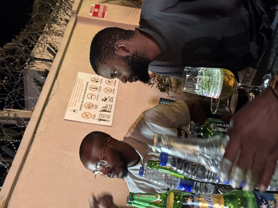 The scene depicts an outdoor nighttime gathering at an establishment in Lugbe, Nigeria. Two adult males are seated at a table, illuminated by artificial light. The male on the left has a bald head, a dark beard, and wears eyeglasses with reddish-brown frames. He is dressed in a light grey polo shirt and looks towards the left, off-camera. On the right, a second male with short, dark, curly hair, a full dark beard, and a silver hoop earring in his left ear wears a dark grey t-shirt. He is looking towards the right, off-camera. A third person's hand is partially visible in the foreground, to the left. The table holds multiple beverages: several green glass bottles (including Heineken and Star Lager), clear plastic water bottles (one with a "Davana" label), a small dark green bottle, and a tall, clear glass bottle. Two glasses are visible; one stemmed glass contains an amber liquid, likely beer, and displays Heineken branding. A shorter glass contains a red liquid. In the background, a light peach-colored wall features two signs. A larger white rectangular sign details "SWIMMING POOL RULES AND REGULATIONS" with nine pictograms, including prohibitions against pets, running, diving, rough play, food/drinks, and smoking, alongside instructions to shower and supervise children. To the right, a smaller red and white sign reads "NOTICE NO LIFEGUARD." Above the wall, against a dark sky, coiled razor wire or barbed wire is visible. Green foliage is present at the base of the wall near the right sign.