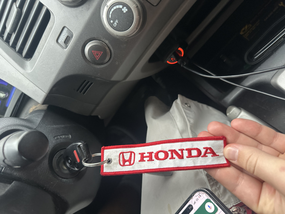 The image displays the interior of a vehicle, focusing on the driver's side dashboard and center console. A human hand, with fair skin, holds a white rectangular fabric keychain featuring "HONDA" in red lettering and the Honda logo, which is attached to a metal key ring. The key ring is connected to a black key fob, which is inserted into the ignition switch located on the steering column. The dashboard, made of gray plastic, shows an air vent, a red triangular hazard light button, and a rotary fan speed control knob. Below these controls, a black car charger with a red illuminated ring is plugged into an accessory power outlet, with two black charging cables extending from it. A partial view of a smartphone screen is visible in the lower-left, indicating a "5G" network connection and what appears to be a voice assistant interface. A light-colored piece of clothing or fabric is visible below the hand. The specific location within Medford, United States, is not discernible from the image.