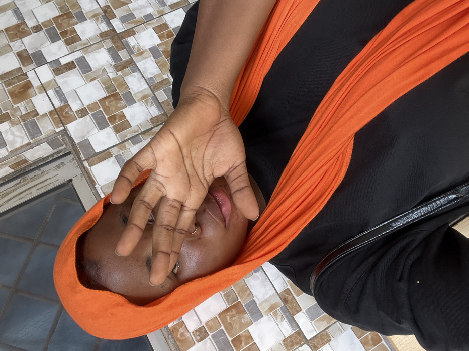The image depicts a close-up, selfie-style view of a single individual, appearing to be an adult female with dark skin, covering part of her face with her right hand