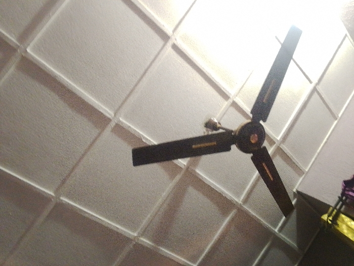 A low-angle shot showcases a three-blade ceiling fan against a textured, white ceiling. The ceiling consists of square panels outlined by raised edges. The fan, dark in color with gold accents, appears positioned slightly off-center and at an angle. A bright light source is located above and behind the fan. Some blurred objects are visible in the lower-right corner.