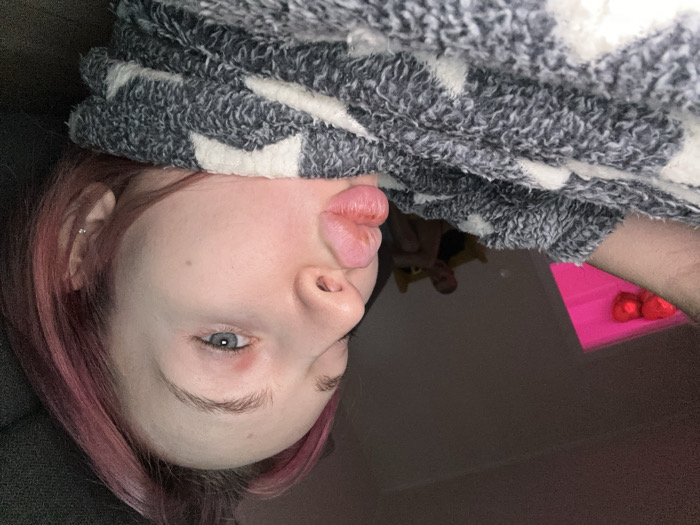 The image depicts an indoor scene in Vsevolozhsk, Russia. The primary subject is a female positioned in the foreground, lying on her side and facing the camera. She has light skin, blue eyes, and short, magenta-dyed hair. Her right upper eyelid displays a distinct reddish discoloration or swelling. Her lips are notably pursed into a prominent "kiss" shape. She is partially covered by a thick, fuzzy garment or blanket, patterned with alternating grey and white sections. In the blurred background, a male figure is seated. He is wearing a dark-colored top and lighter-colored lower garments. A large, yellowish-brown plush toy is visible behind and to the right of the seated male. To the far left background, two red, heart-shaped objects are illuminated by a strong pink light source, casting a noticeable pink glow on the adjacent wall. The overall environment is dimly lit, suggesting a private residential setting such as a living room or bedroom. No direct interaction between the two individuals is observed.