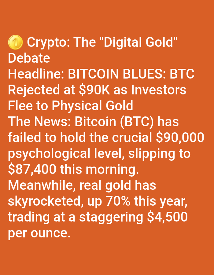 A news report highlighting Bitcoin's struggle and gold's surge. The headline "BITCOIN BLUES" reveals BTC's rejection at $90,000, causing investors to flee to physical gold. Bitcoin failed to hold the $90,000 psychological level, slipping to $87,400. Real gold, however, has skyrocketed, with a 70% increase this year, trading at $4,500 per ounce. The image is a digital post on an orange background.