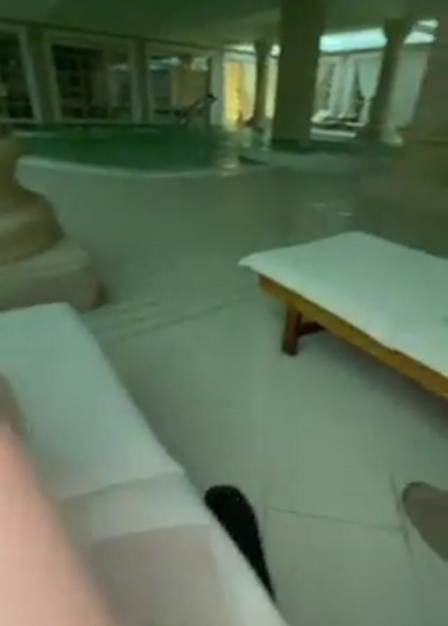 legs of a person lying on a white lounge chair next to an indoor pool area with several pillars. The person has a tattoo on their left leg. The camera pans to the right to show two young women in bikinis lying on lounge chairs next to each other. One is looking at her phone. There are several other lounge chairs with people on them in the background. The area has a serene and spa-like atmosphere.