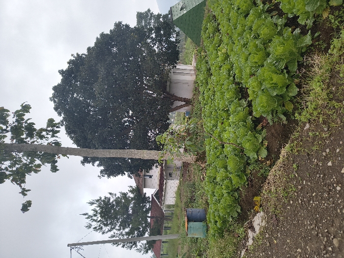 An agricultural scene in An Khe Ward, Vietnam, is depicted under an overcast sky. The foreground features a dirt path on the left, bordering a field of rows containing uniform, vibrant green leafy vegetables, likely cabbage or lettuce, cultivated in dark soil. Two blue and green metal barrels are stacked near the path on the left side of the field. A tall, slender tree with light bark and sparse foliage stands centrally within the frame. Behind it, a large, dense, dark green tree partially obscures a small, white, rectangular structure. Further back and to the left, two white-walled houses with reddish-brown tiled roofs are visible, one featuring a small, multi-story section or tower. A utility pole with wires is positioned on the far left, in front of two tall pine trees. On the right side of the cultivated field, a small, green, pyramidal structure is present. Distant hills or mountains are faintly visible on the horizon beneath the light gray, cloud-covered sky. No individuals, actions, or interactions are observable.