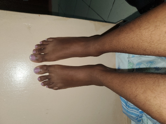 The image displays a pair of human lower legs and feet, viewed from an elevated perspective, in an undetermined indoor location within the city of Unknown, Unknown