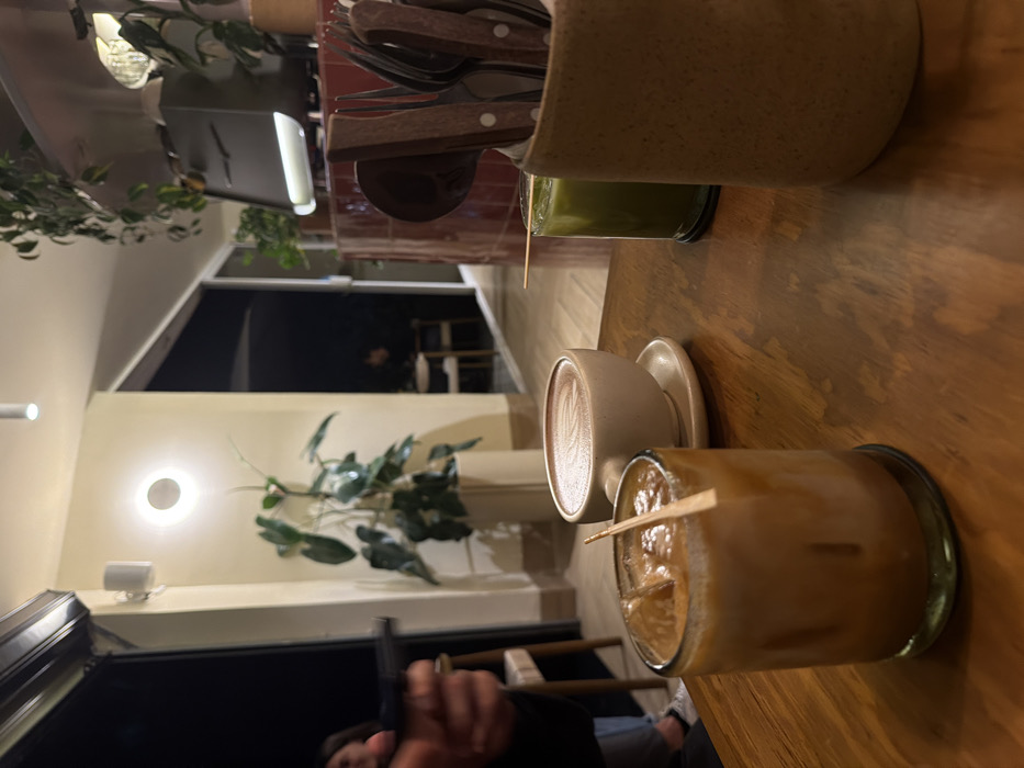 A wooden table displays various beverages. A glass filled with a green liquid stands next to a utensil holder. In the foreground, a cup of latte art and a glass of iced coffee with a stirring stick are visible. A potted plant and a bright circular light can be seen in the background. Part of a person is visible at the bottom of the image.