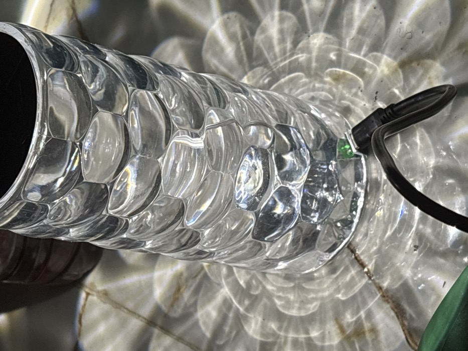 A cylindrical glass object with a honeycomb pattern reflects light onto a marble or stone surface. A black power cord is plugged into the object's end. The interior of the cylinder is black. Light passing through the glass creates intricate patterns of illumination on the underlying surface. The top of a green object is in the lower right corner of the image.