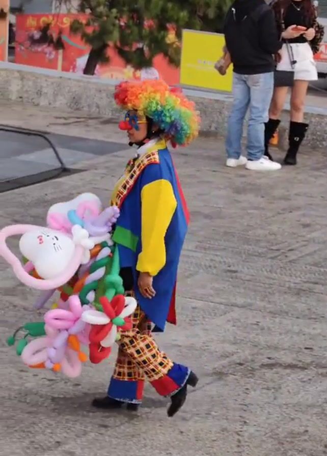 A clown with a colorful rainbow wig, red nose, blue glasses, and a colorful costume walks across a gray concrete surface, carrying a bunch of balloon animals. The clown's costume includes a blue top with a yellow shoulder and red back, and checkered pants. In the background, several people are milling about, including one person sitting on a red stool and another person cleaning. There are trees and a billboard in the far background.