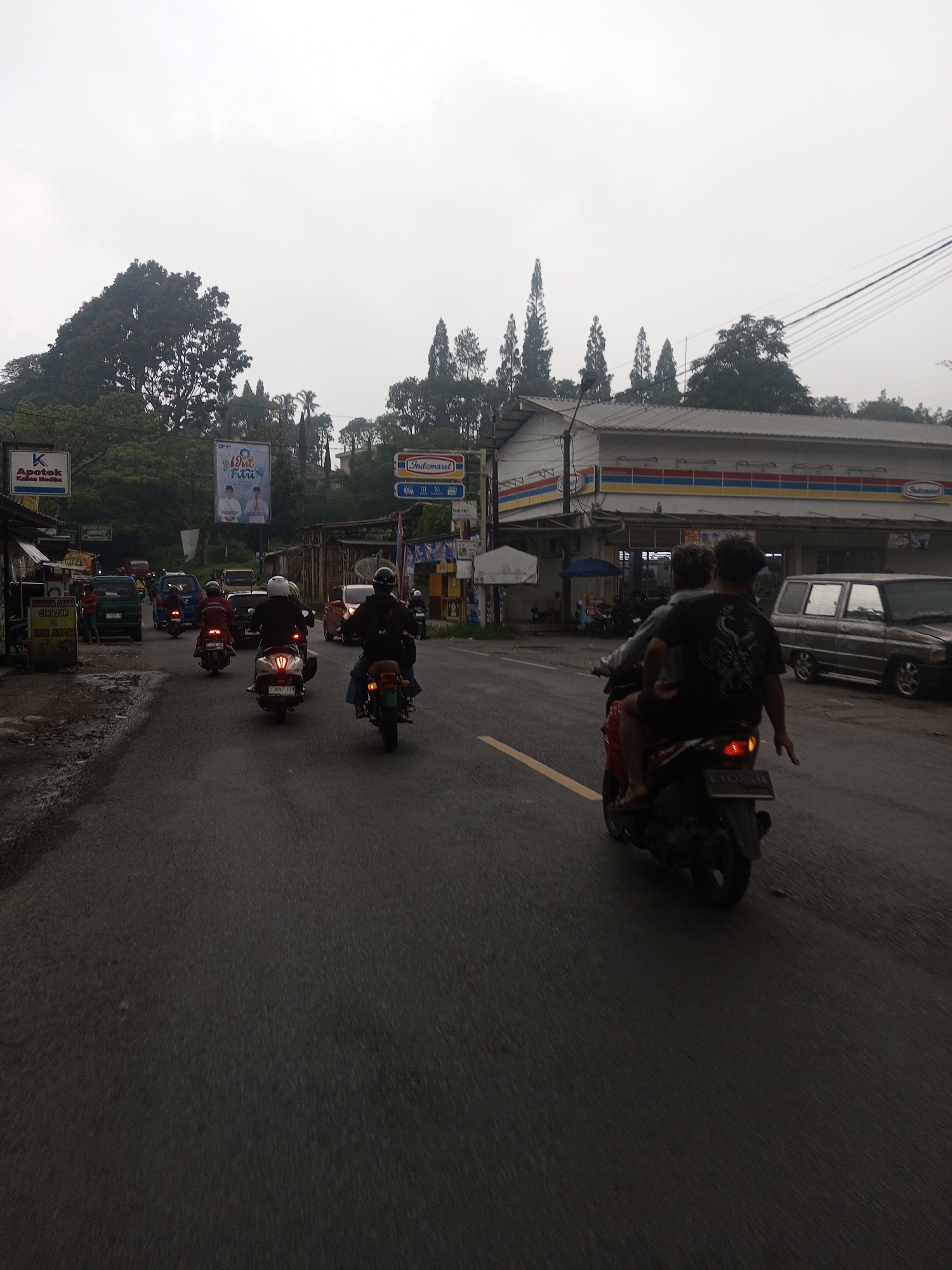 The image depicts a bustling street scene under an overcast sky, located in Indonesia rather than Kan Beit, Myanmar, as evidenced by prominent "Indomaret" stores and Indonesian vehicle license plates. The asphalt road appears damp, indicating recent rain or mist. In the immediate foreground, the rear of a dark-colored motorcycle is visible, carrying two male riders. Neither rider is wearing a helmet. The motorcycle's tail light is illuminated, and a partial Indonesian license plate, "B 6032 YGN" (indicating Jakarta region), is discernable. A yellow solid line is painted on the road surface to the right of the motorcycle. Further into the midground, a continuous stream of traffic, predominantly motorcycles, moves away from the viewer. One light-colored scooter, bearing an Indonesian license plate "F 5787 FIH" (indicating West Java region), is ridden by a single individual wearing a white helmet. Other motorcyclists, some helmeted and some not, are also present. A green small truck or van is observed on the left side of the road, while a silver van is on the right. The left side of the street is lined with commercial buildings, including a shop with a sign for "Apotek Kalua Medika" (Pharmacy Kalua Medika). A densely vegetated hillside with large trees rises behind these structures. On the right side of the street, a prominent "Indomaret" convenience store building with a distinct red, yellow, and blue striped facade is visible. Several motorcycles are parked near its entrance. Overhead, utility poles and power lines are crisscrossing. A large billboard displaying an advertisement with two men and Indonesian text is situated further back on the left, near the treeline. The scene conveys an active urban or semi-urban environment.