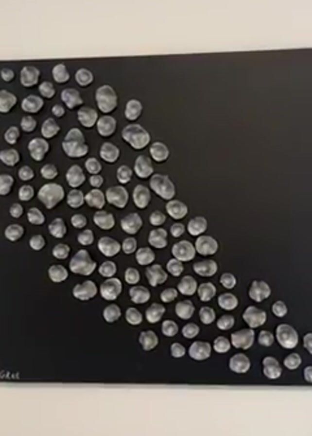close-up view of a piece of art on a wall. The art piece is a rectangular black canvas with a scattering of roughly rounded, silver-colored shapes adhered to the left side of the canvas. The shapes appear to be arranged in a diagonal pattern. The rest of the canvas on the right side is plain black. There is a signature in the lower left corner of the canvas, but it is illegible. The wall is white. The camera slowly zooms in to provide a closer view of the art piece.