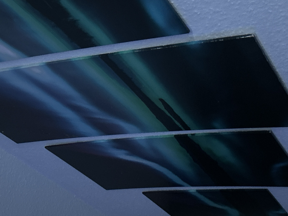 The scene depicts an interior wall in Karlsruhe, Germany, displaying a four-panel art installation. The wall is textured and painted a uniform light blue or periwinkle color. Four rectangular canvas panels, varying in size, are mounted horizontally along the wall, collectively forming a single, continuous image. From left to right, the panels generally increase in height towards the center, then decrease. The leftmost and rightmost panels are partially visible. The artwork on the panels features an abstract composition of dark blues and teal-greens, with luminous, swirling patterns suggestive of an aurora borealis, intersected by subtle, dark, diagonal lines. The environment is dimly lit, imparting a cool, bluish cast to the entire scene. No individuals, actions, or interactions are present.