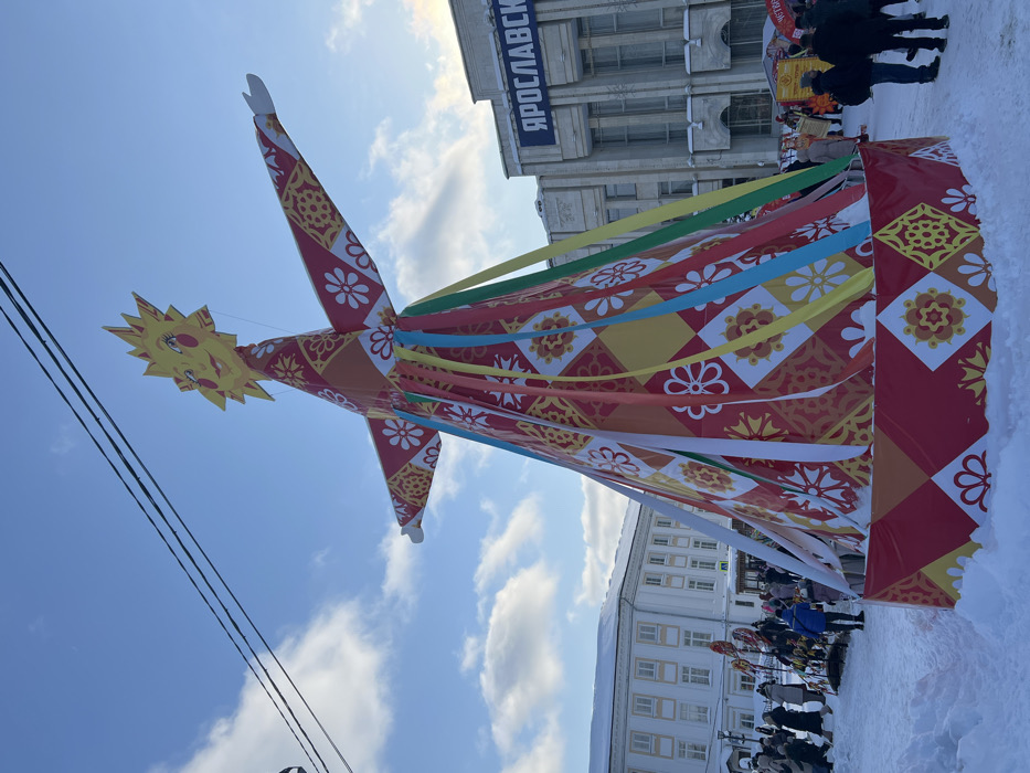 A large, colorful effigy resembling a traditional Maslenitsa figure stands prominently in a snow-covered public square. The effigy features a yellow sun-like face with rosy cheeks and a smile, a conical body adorned with red, orange, yellow, and white geometric and floral patterns, and two outstretched arms. Multiple long ribbons in red, yellow, light blue, and green hang from its body. The ground is covered in a substantial layer of white snow. The sky is clear blue with scattered white clouds, and two dark overhead lines are visible in the upper left. In the background, to the left, is a multi-story white building with numerous windows, exhibiting classical architectural elements. To the right, a modern, light-colored building bears a large Cyrillic sign on its upper facade reading "ЯРОСЛАВСК," indicating the location as Yaroslavl, Russia. Numerous individuals, dressed in winter clothing, are distributed across the snowy square, suggesting a public event or festival.