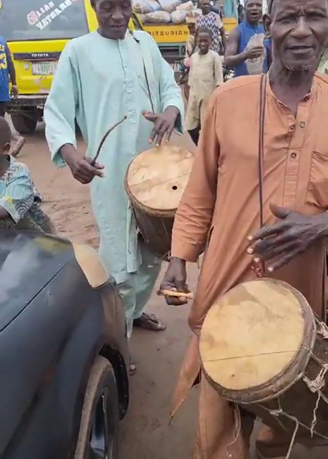 Two men are playing drums in an outdoor setting. The man on the left is wearing a light green outfit and a patterned kufi. He is using a stick to strike the drum. The man on the right is wearing a brown outfit and a patterned kufi. He is playing the drum with his hands. Both drums are suspended by a strap that crosses their bodies. A black car is parked beside them on the left side of the frame. In the background, there is a yellow van with people on top of it, and some other people standing around. A small child is sitting next to the car, smiling. The scene appears to be in a public area or a roadside.
